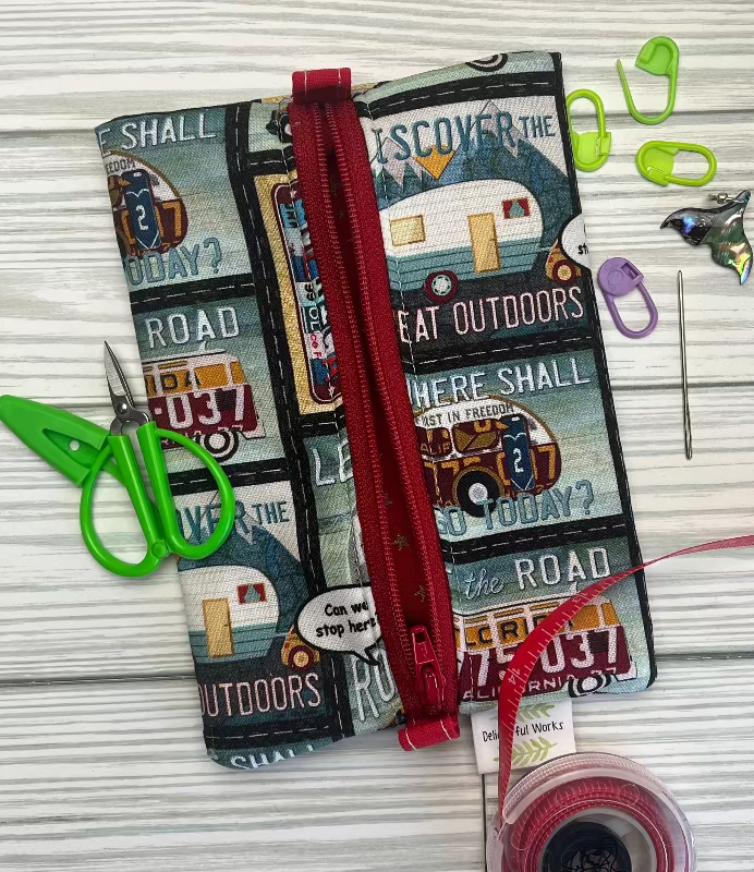 This darling notions bag is perfect for your purse or project bag. Measuring a bit over 4" x 6", a tape measure, snips, and stitch markers can fit inside. Perhaps a small pack of mints, gum, and a few dollars can also be tucked inside.